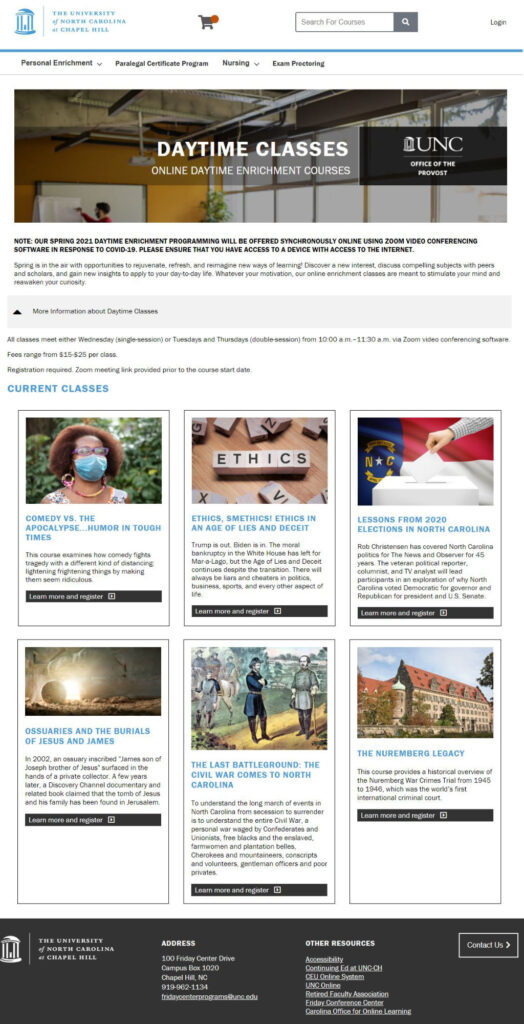 The UNC CH Friday Center site included information and registration for a wide variety of in-person and distance education classes. I was responsible for redesigning the site and integrating it into our registration systems for both online and in-person courses.