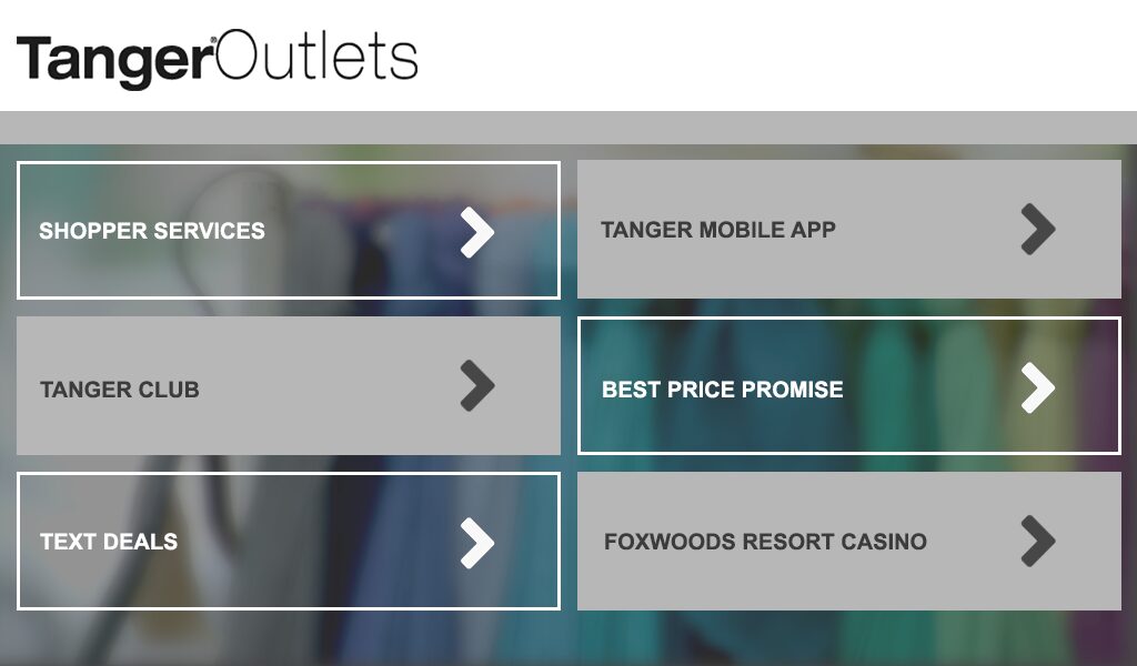 The Tanger Outlets screen provided site information as well as registration through SMS for coupon subscription.